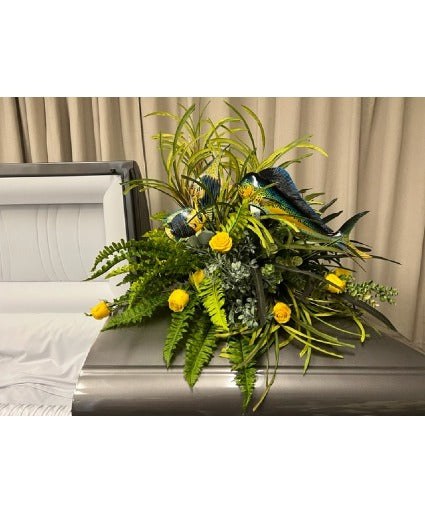 Casket spray of lots of greenery with roses and ornamental fish. Perfect for someone who loved nature and the great outdoors.