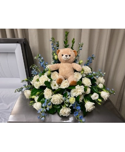 A small but beautiful display of white roses with color of choice in accenting flowers. Bear is included.